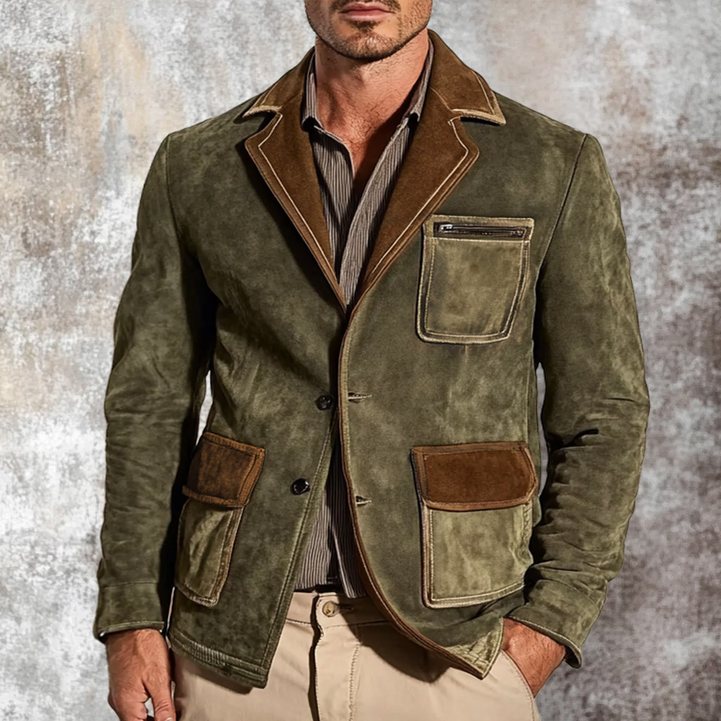 Men's Vintage Suede Multi-Pocket Color Block Reversal Collar Outdoor Jacket