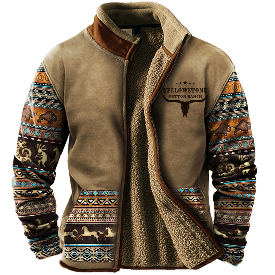 Men's Vintage Ethnic Print Fleece Zipper Tactical Shirt Jacket
