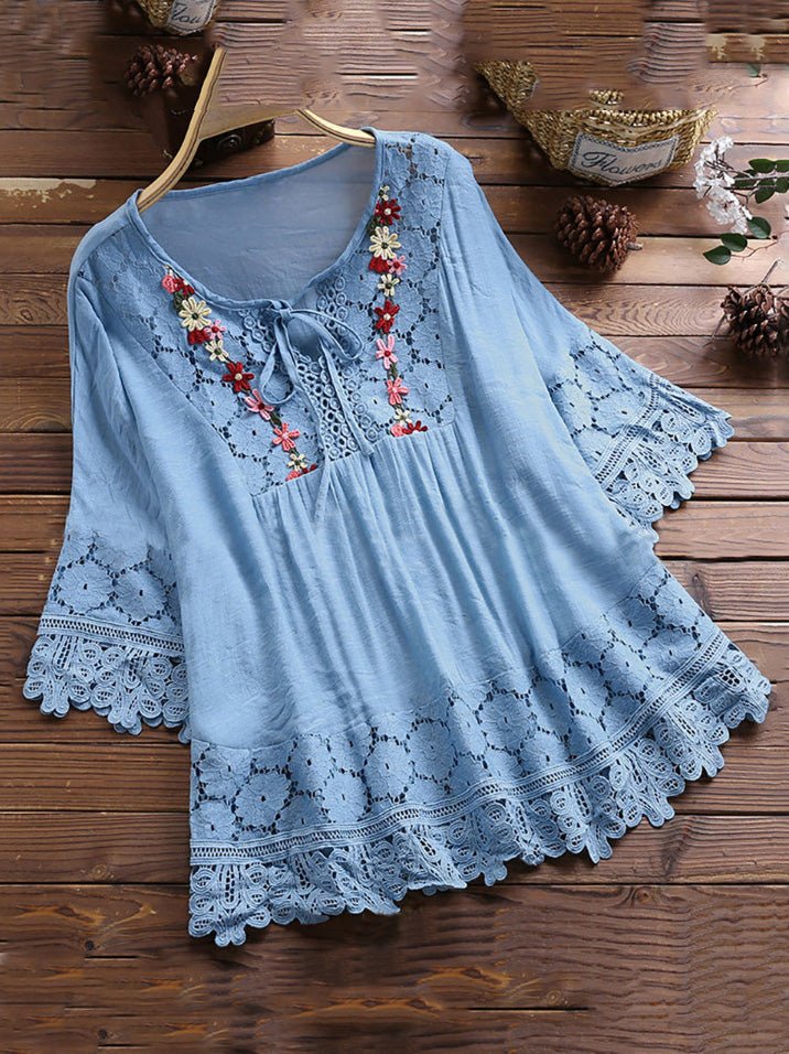Women's Blouses Loose Belted Lace 3/4 Sleeves Blouse