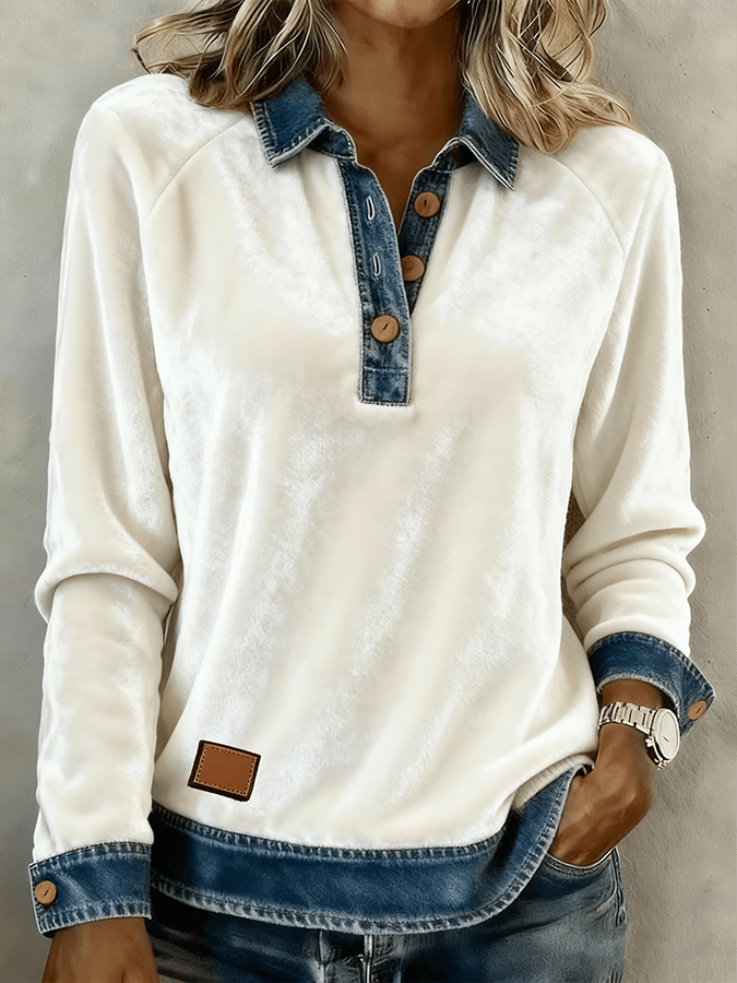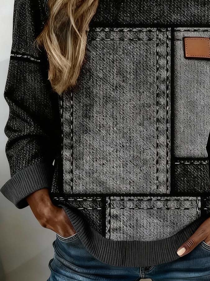 Women's Casual Collared Denim Patchwork Waffle Knit Sweatshirt