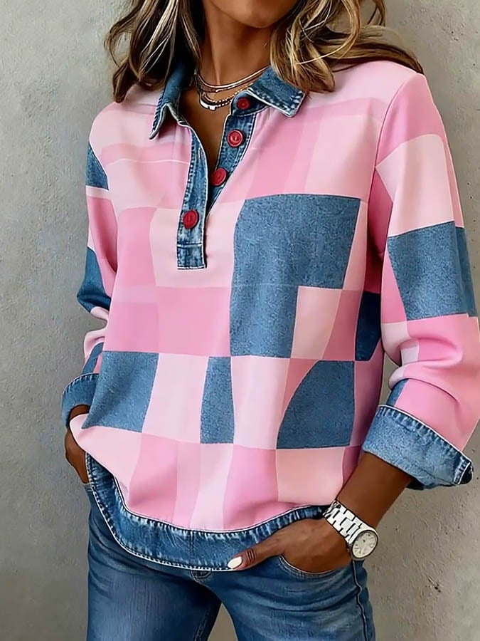 Women'S Casual Lapel Contrast Color Stitching Plaid Top