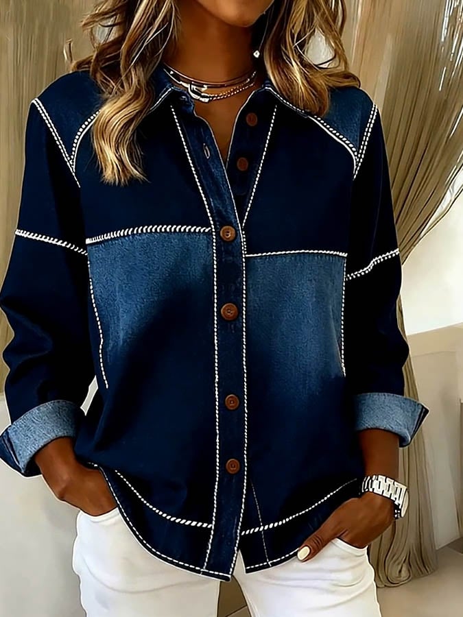 Women'S Casual Loose Contrast Color Stitching Shirt