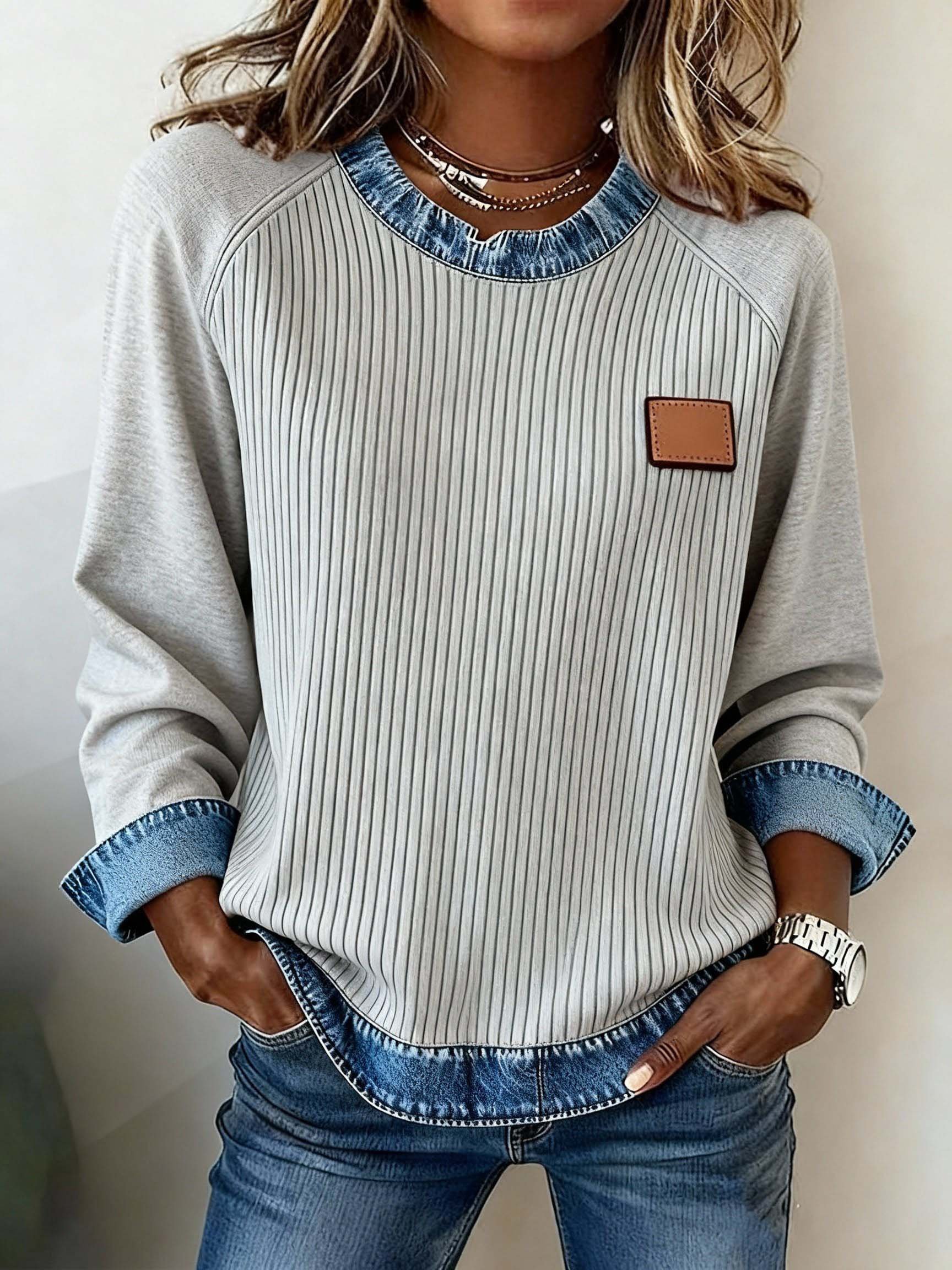 Women'S Casual Round Neck Contrast Color Stitching Pullover Sweatshirt