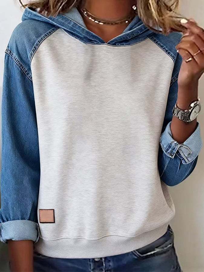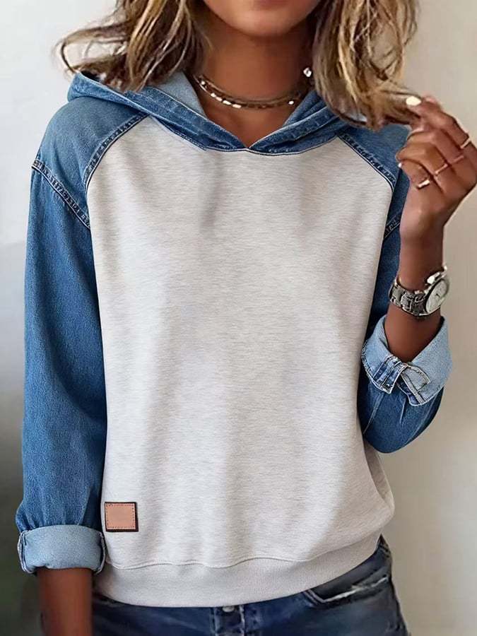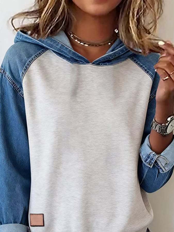 Women'S Casual Hooded Denim Patchwork Pullover Sweatshirt