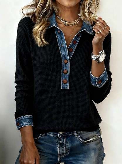 Velmora™ | Textured Knit Button-Collar Top