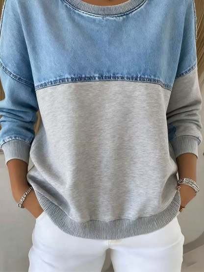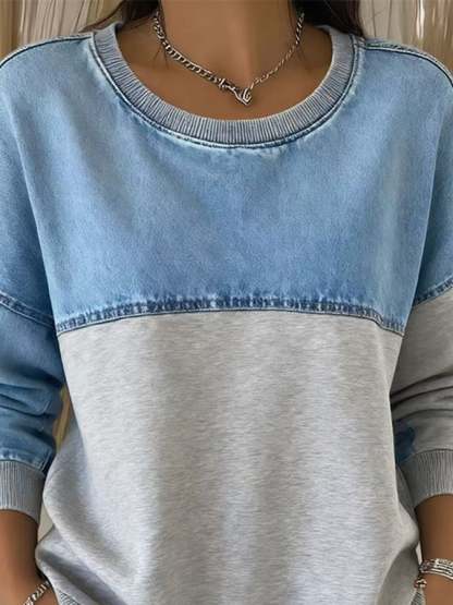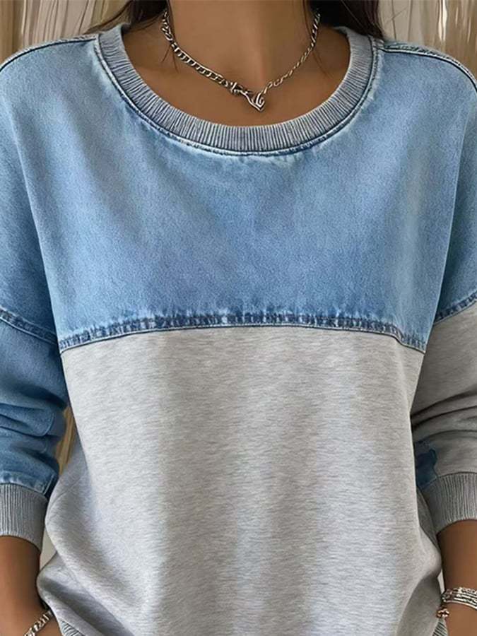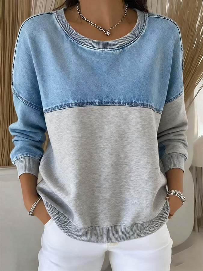 Women'S Casual Round Neck Denim Patchwork Sweatshirt
