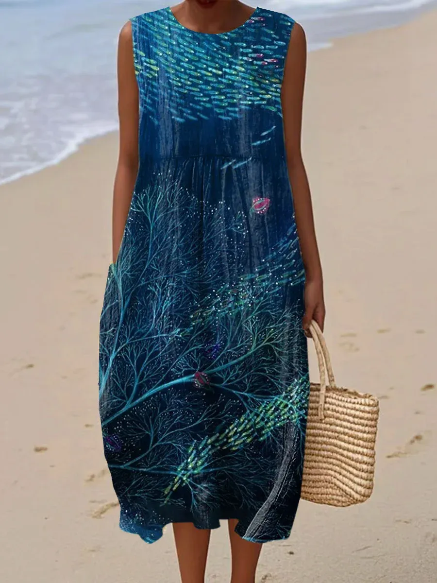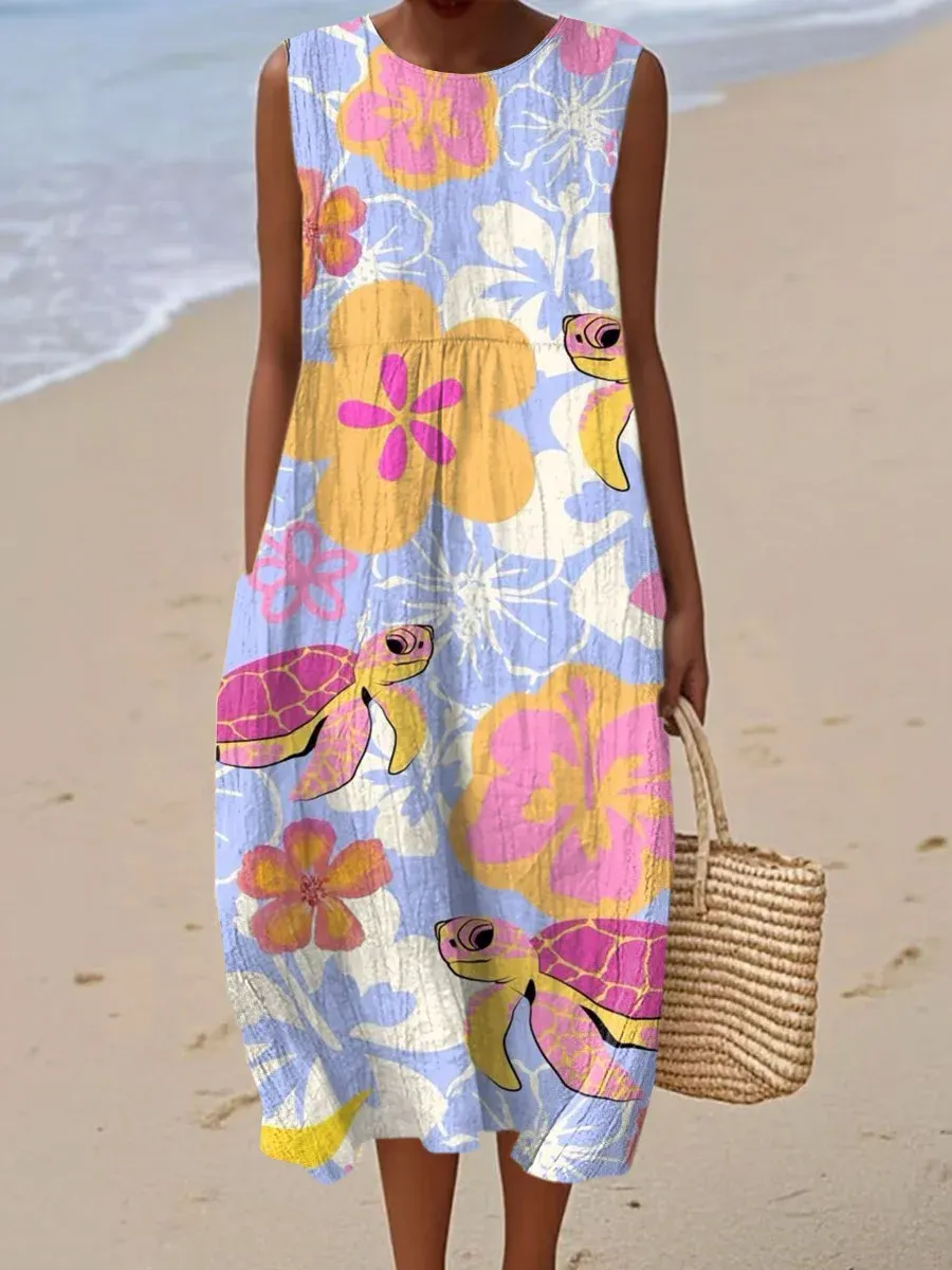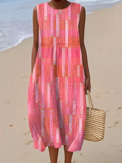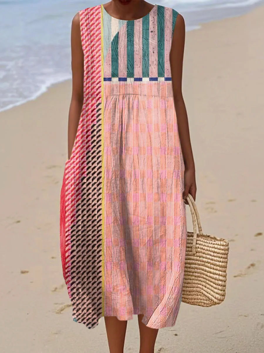 Women's Vintage Abstract Geometric Art Print Sleeveless Cotton Pocket Wrap Dress