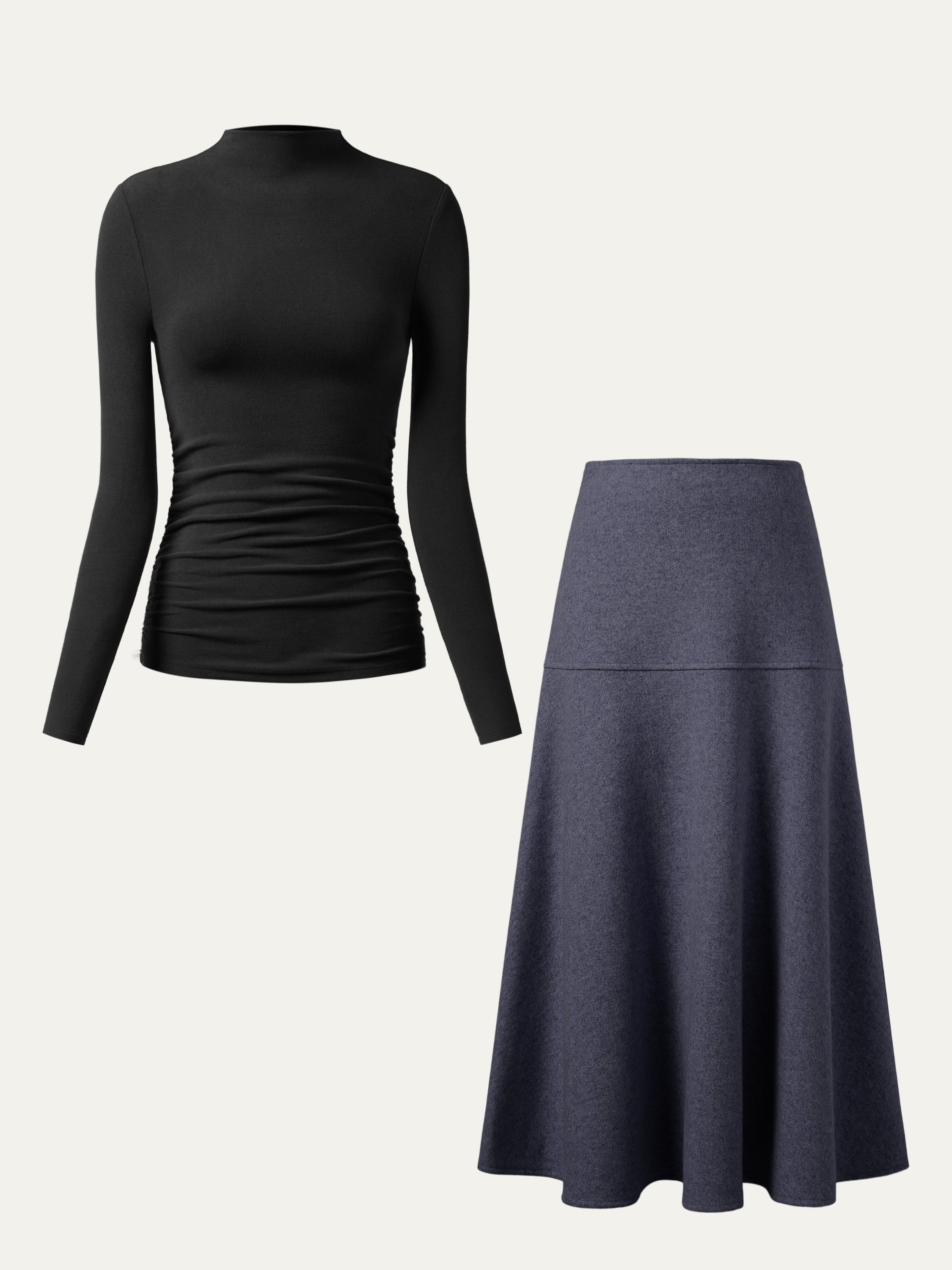 2Pcs Set Ruched Sides Tuckable Mockneck Top & Flared Maxi Skirt