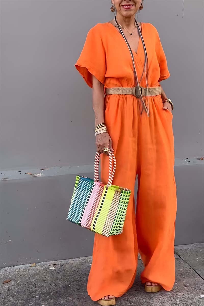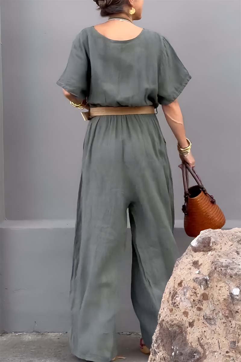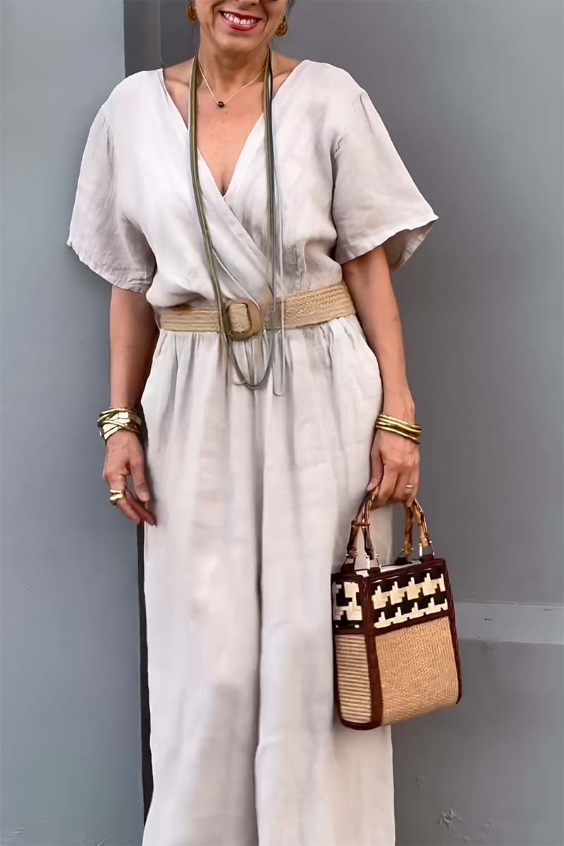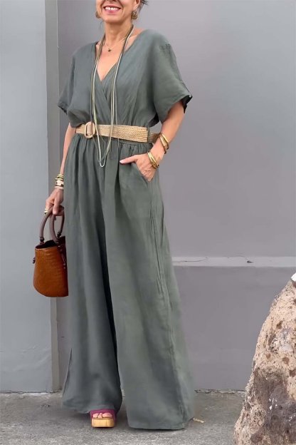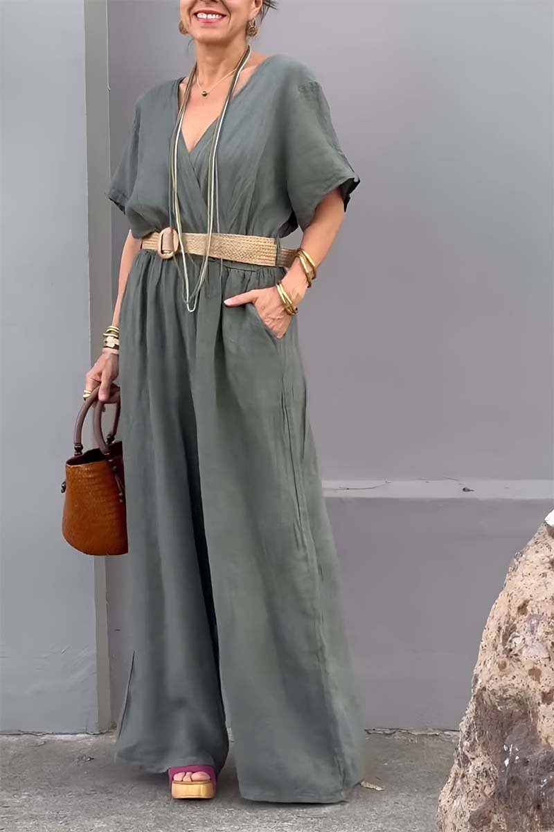 Casual V-neck cotton and linen jumpsuit