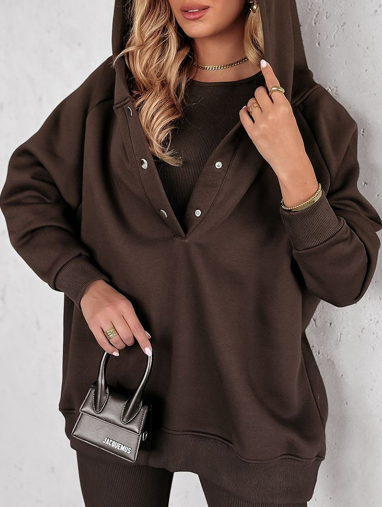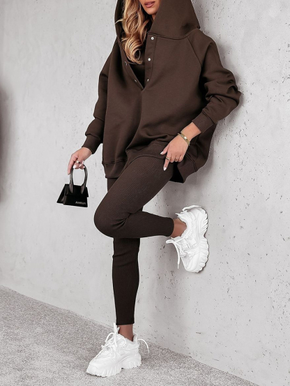 A tracksuit set is perfect for a comfortable look. The set includes a ribbed top, an oversized hoodie and high-waisted leggings. This is a proposition that will look phenomenal as a set or separately.