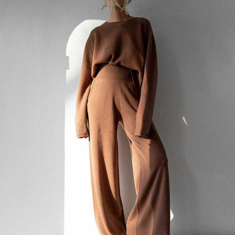 Retro Reddish brown High Waist Two-Pieces Sweater Suit