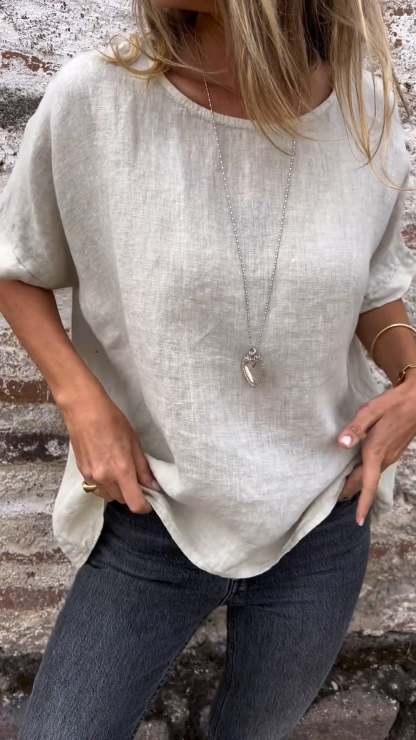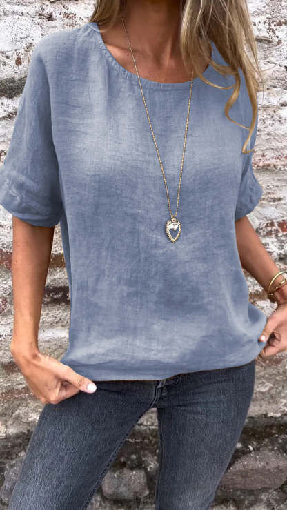 Solid Color Round Neck Half-sleeved Cotton Linen Blouse