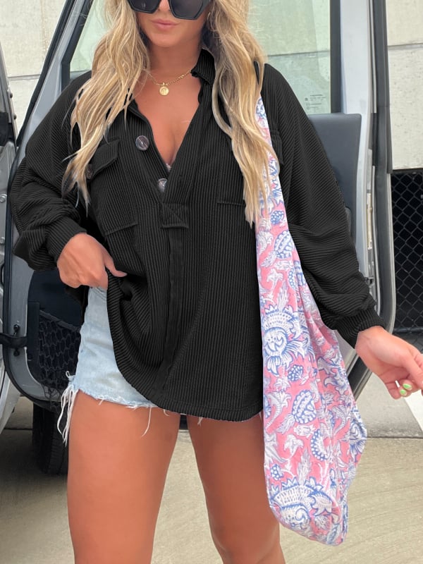 VALLEY GAL ribbed knit long sleeve. Opens up as a layering piece for versatility and ease! Can be paired with any shorts or pants!