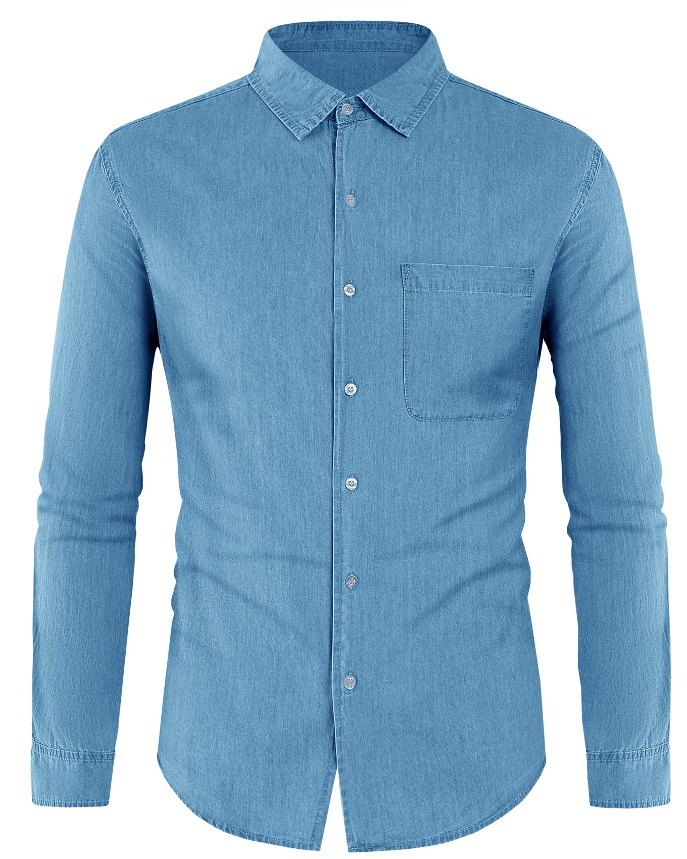 - Classic casual button down shirt for men with comfortable jeans fabric, featuring a turn down collar neck, button up closure, single chest pocket, loose fitting and plain color.