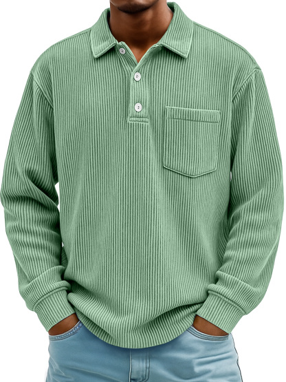 Men's Daily Ribbed Lapel Button-down Casual Pocket Long-sleeved Polo Shirt