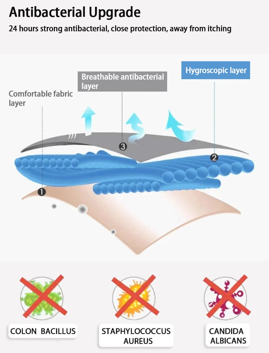 quickly absorbs and locks liquid, keeps your underwear dry, and inhibits bacteria to protect your health! No smell all day long!