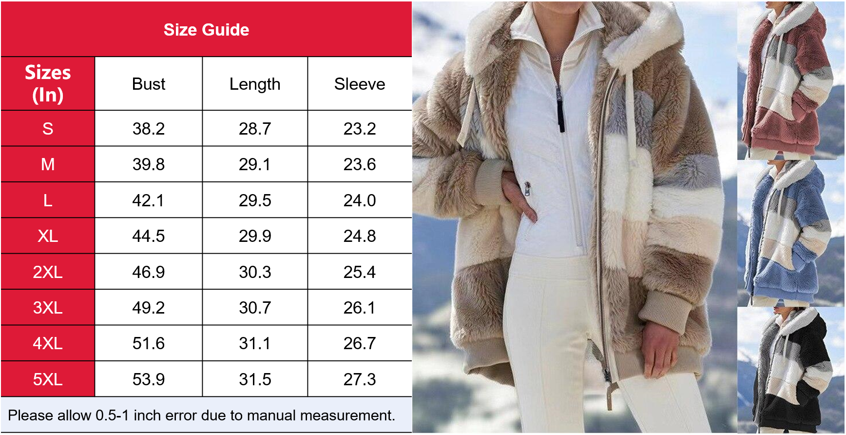 Material: This fashionable jacket is made of artificial fleece, polyester and spandex. The material is soft and skin-friendly and comfortable to wear. It is soft, warm and light. Give you a nice and warm winter.
