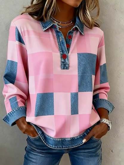 Women'S Casual Lapel Contrast Color Stitching Plaid Top