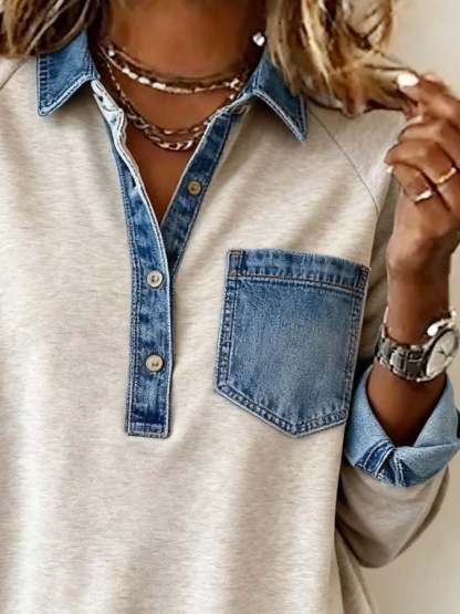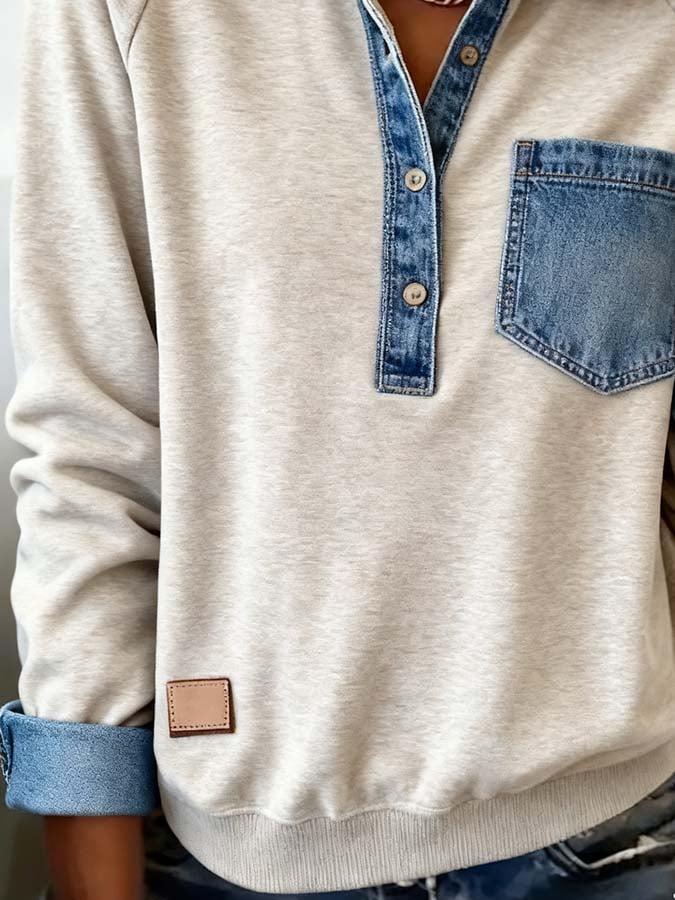 Women'S Casual Pullover Denim Patchwork Sweatshirt
