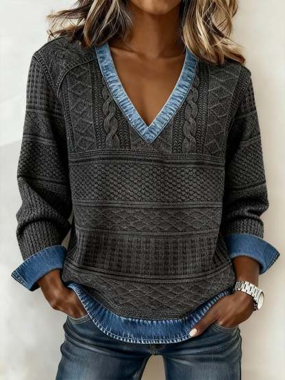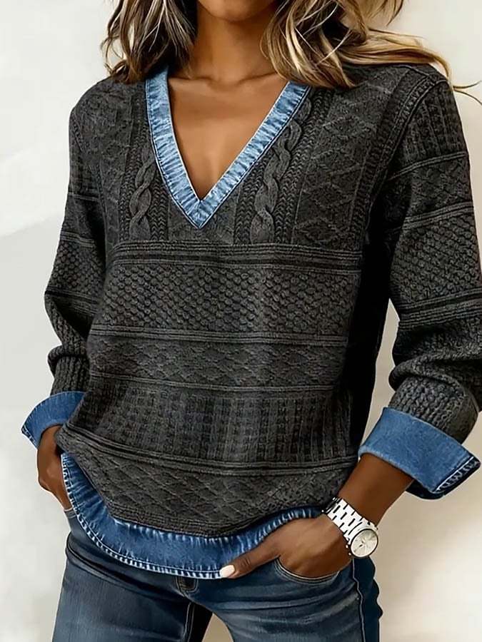 Women's Casual V Neck Denim Patchwork Print Pullover Top