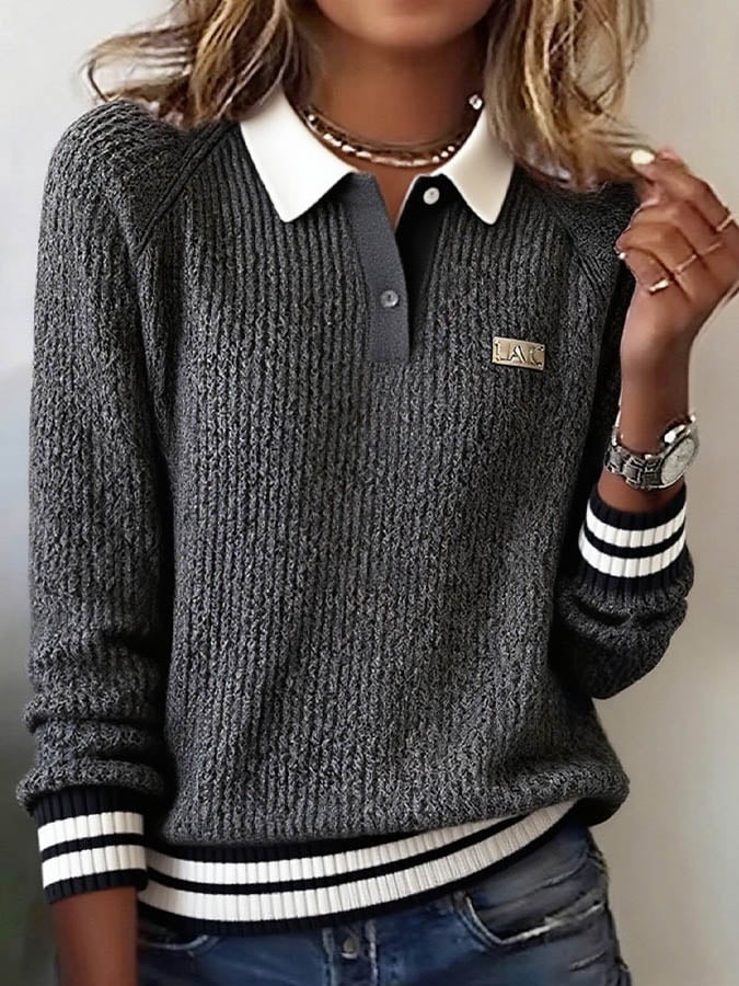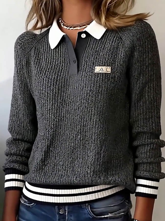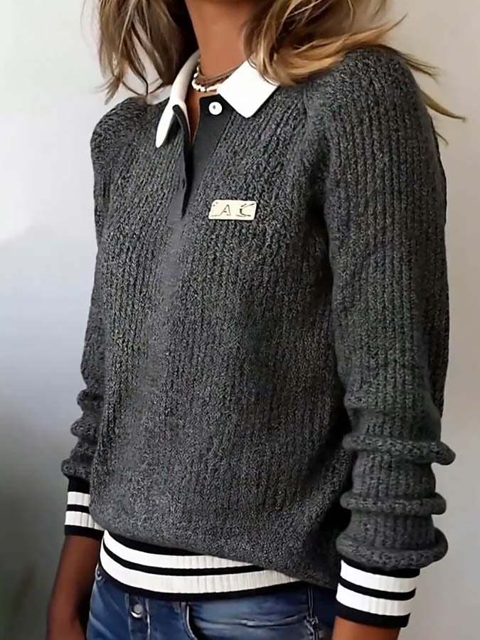 Women'S Contrast Lapel Long-Sleeved Knitted Sweater